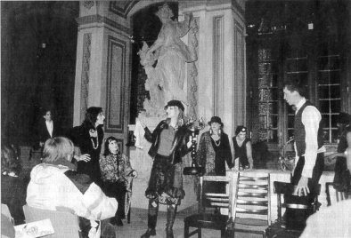 ... Eine ungewöhnliche Theaterdar-bietung am ungewohnten Ort lockte eine stattliche Anzahl Besucher in die kühlen Hallen des Vestibüls im Bruchsaler Schloss. "Smaragd im Mund - ein Stück verrückt", so betit-elt die Karlsruher Spielgemeinde ihre zweite Eigenproduktion, mit der sie gern an unüblichen Theaterorten auftritt. ............................................... ...Die Collage, ein rundes dutzend Spielszenen, mehrfach unterlegt mit literarischen Texten namhafter Au-toren, rankt sich um ein Generalthe- ma,das wir üblicherweise mit den Ei-genschaftswörtern "verrückt" oder "wahnsinnig" belegen. Aber sind nicht selbst Visionäre wie die Äbtis-sin Hildegard von Bingen oder etwa die Propheten letztlich Spinner, gar "Verrückte"? Wo ist die Grenze zwi- |